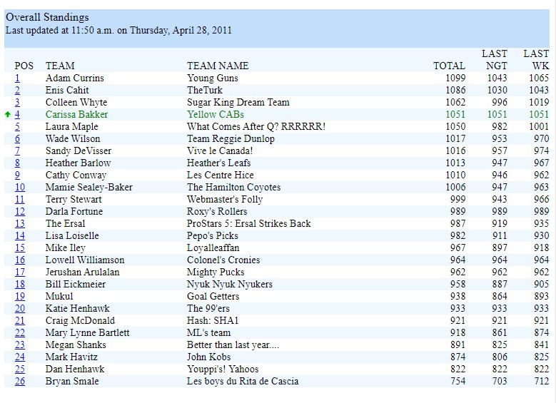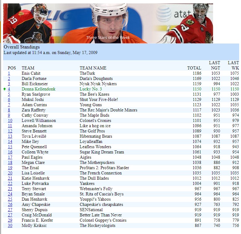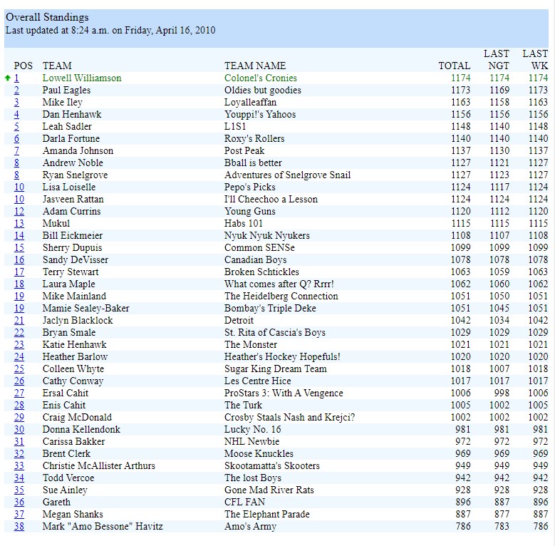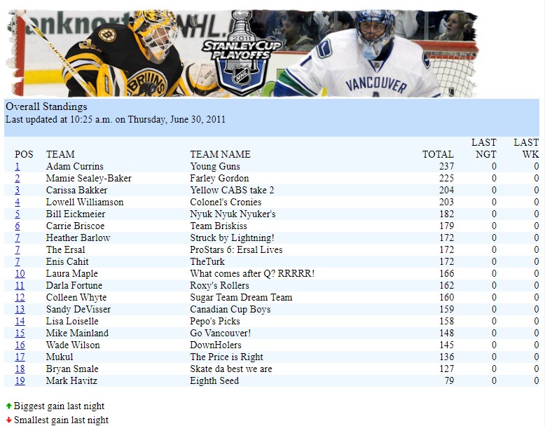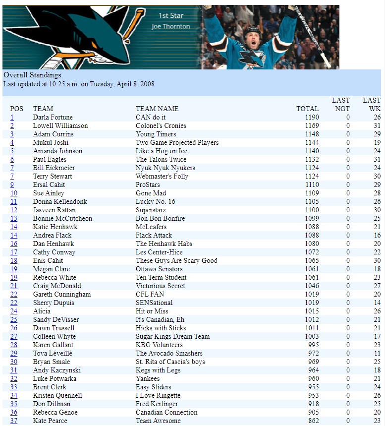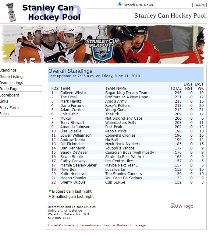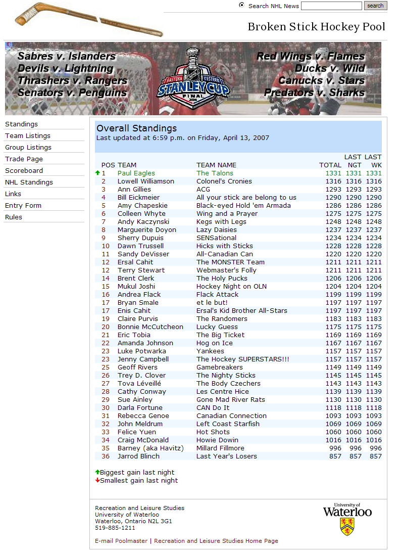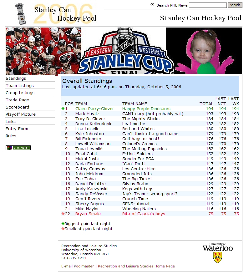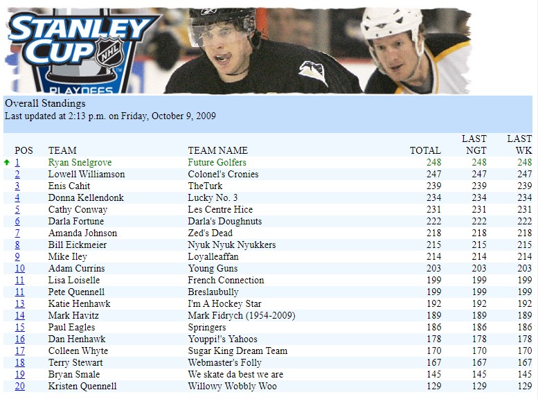 Past Winners 1995 ..... Patrick Leckey 1993 ..... Bryan Smale 1989 ..... D. Goodwin 1988 ..... Dave Fennell 1983 ..... Terry Stewart 1980 ..... D. Goodwin 1980 ..... Lloyd Heywood 1980 ..... Bryan Smale 1979 ..... Terry Stewart Note: In the early years we ran typically ran three pools - Sept-Jan, Jan-Apr, and Stanley Cup pool. |